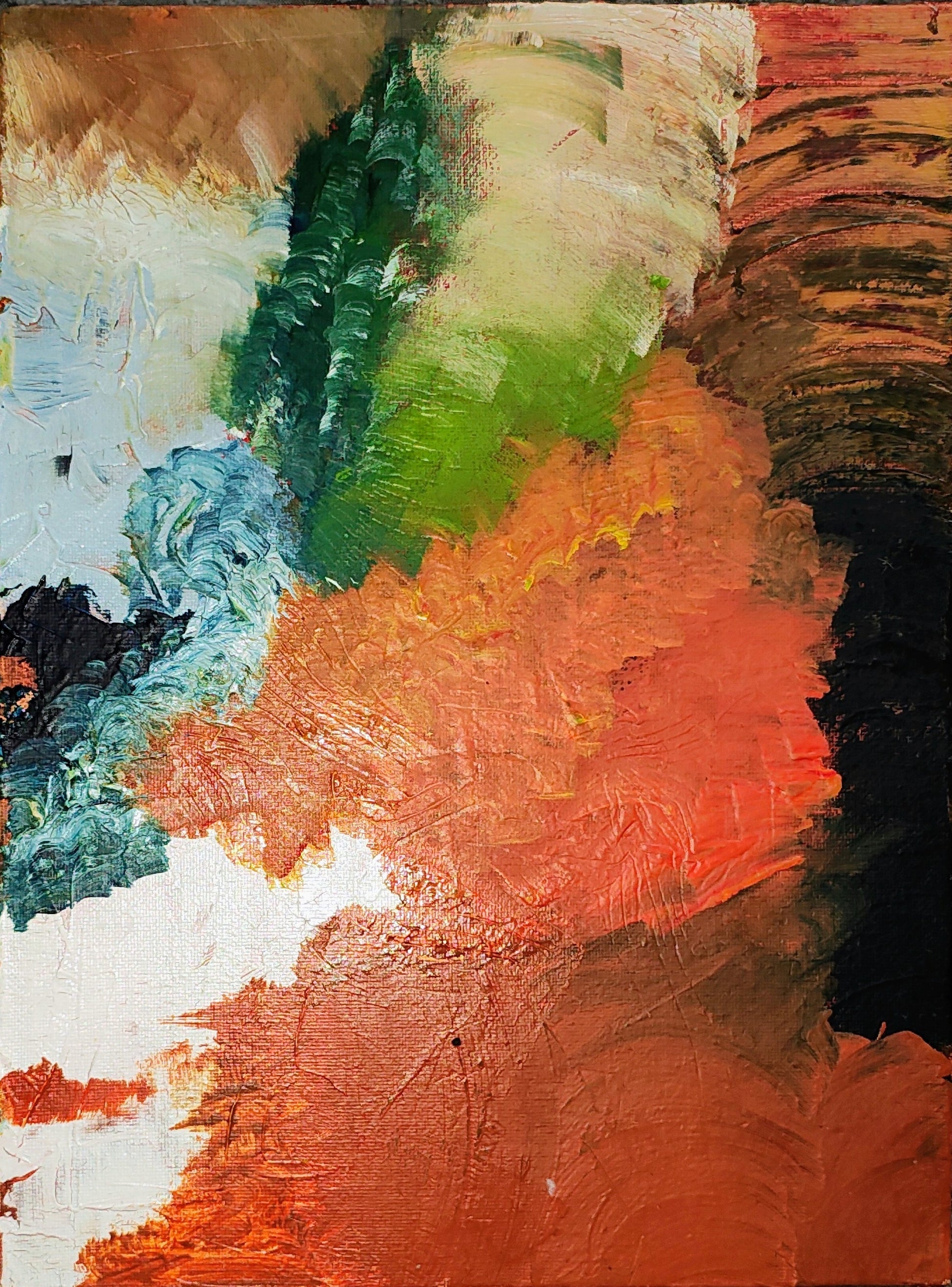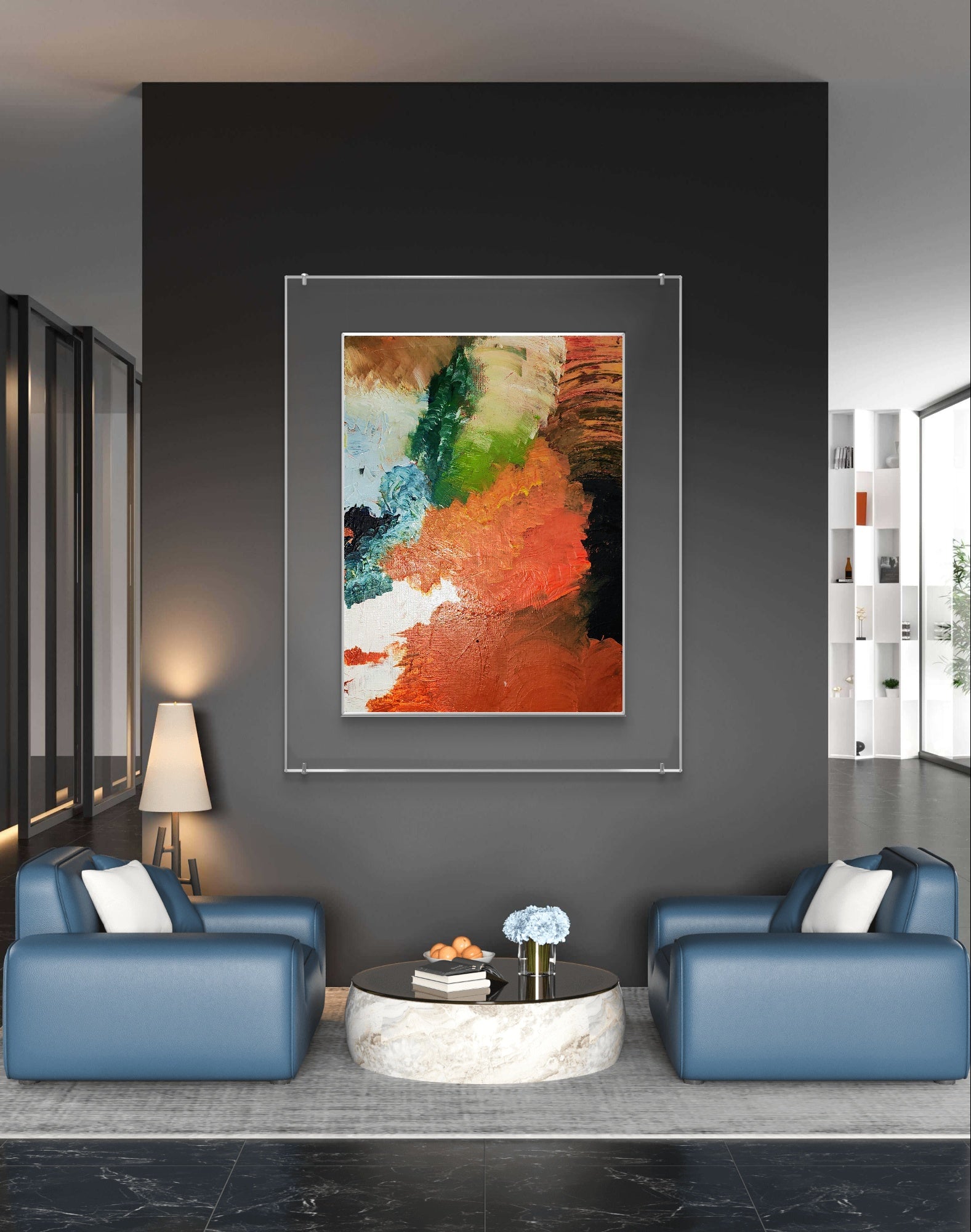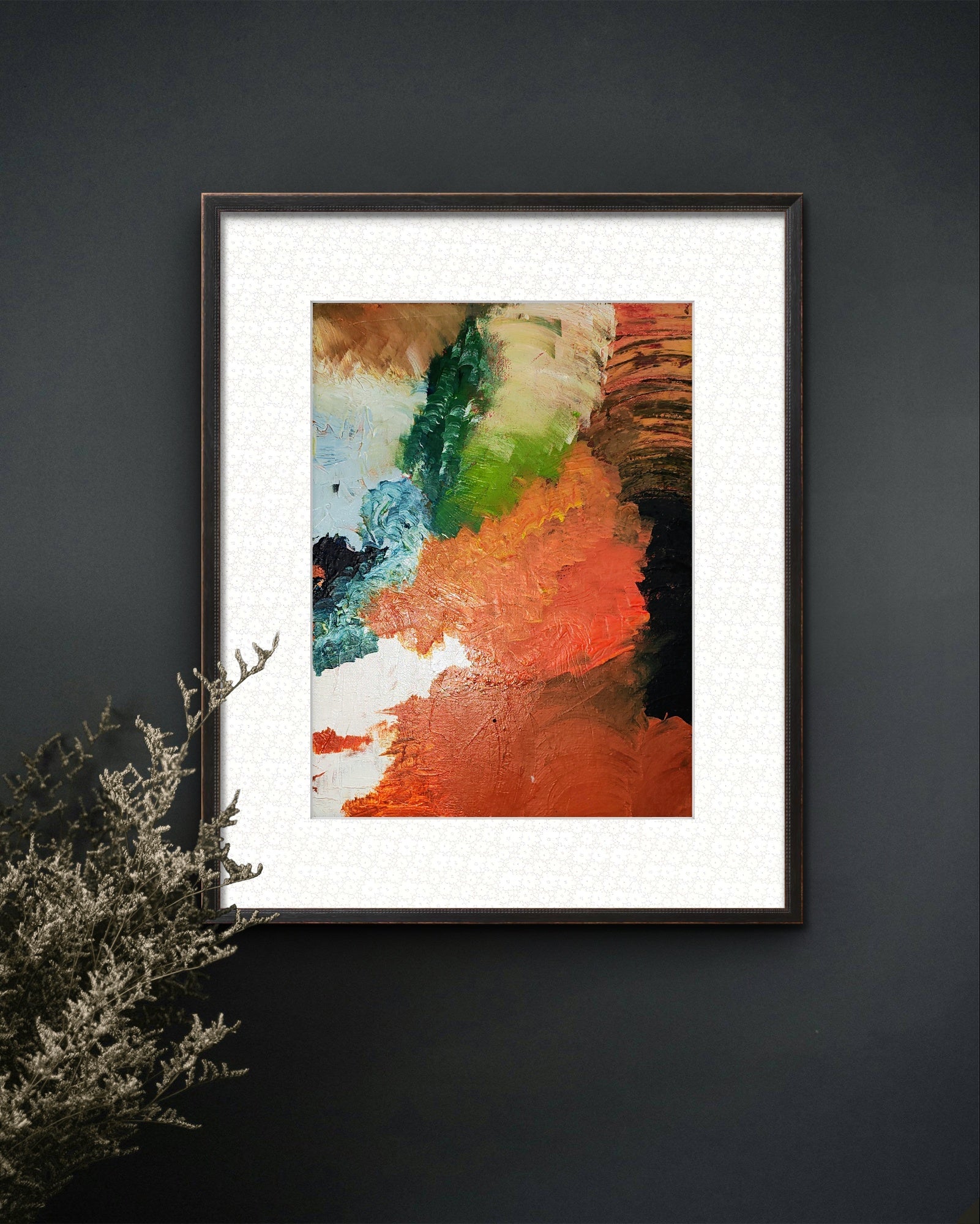 This abstract oil painting captures a dynamic interplay of earthy and vibrant hues, suggesting the resilient emergence of life from a textured, almost scorched landscape. Bold strokes of fiery orange and deep rust dominate the lower portion, evoking a sense of heat and foundational earth. Ascending from this base are strokes of cool blue and white, hinting at water and air, juxtaposed with vibrant greens that represent burgeoning foliage. The composition is marked by gestural brushstrokes that create a tactile surface, adding depth and energy to the artwork. it has the potential to enhance any sophisticated living space.