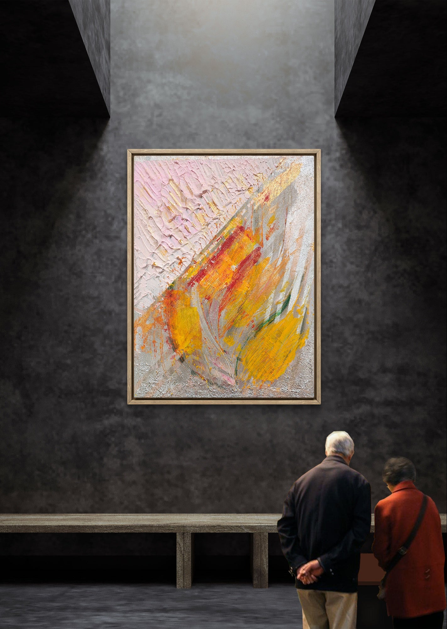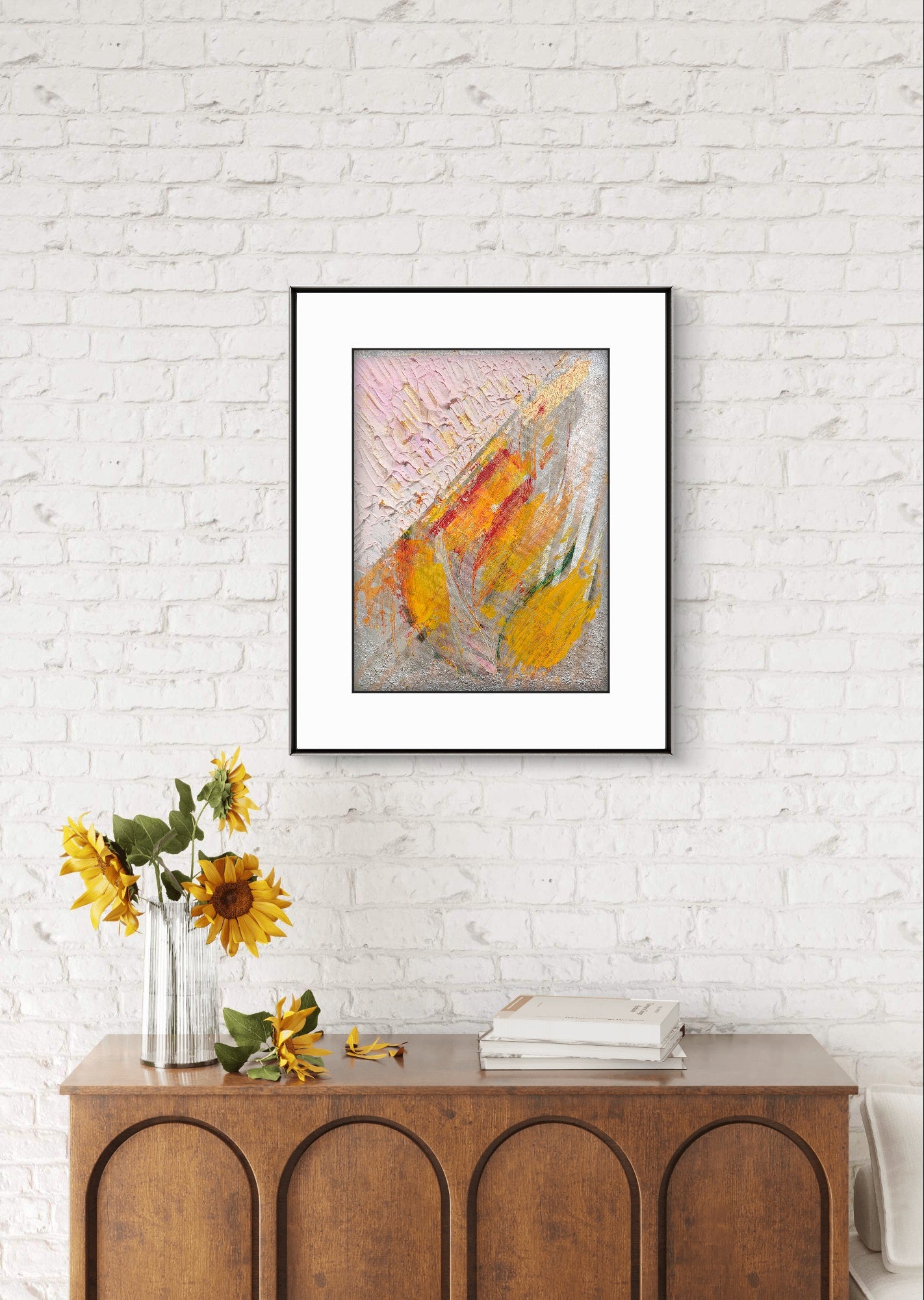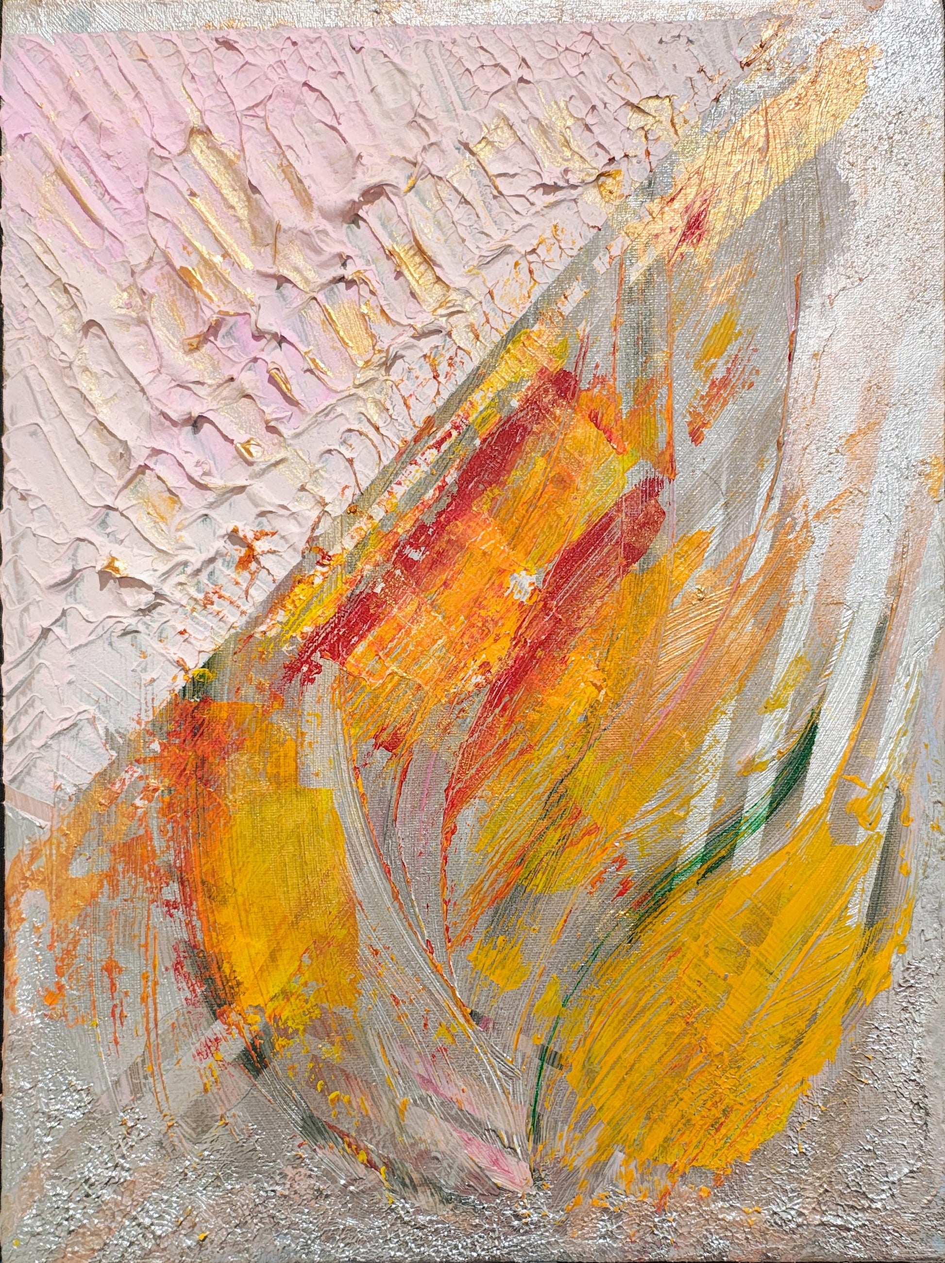 Introducing Golden Dawn, an exquisite artwork that embodies light and renewal. Its luminous tones of gold, saffron, and delicate blush evoke the brilliance of the morning sun. The rich impasto texture and refined black frame add sophistication and warmth, making it a sanctuary for collectors who appreciate elegance and the poetry of color.