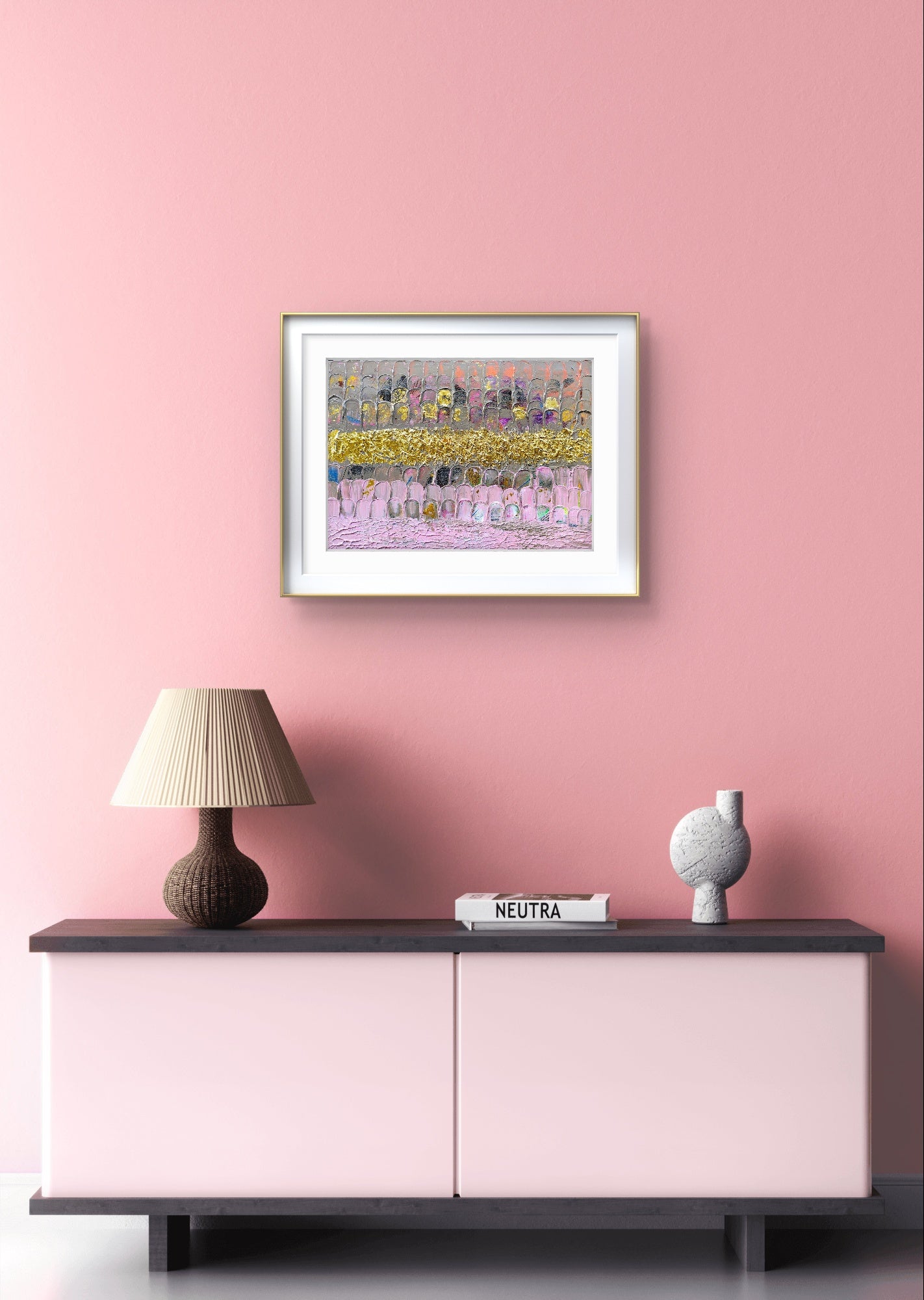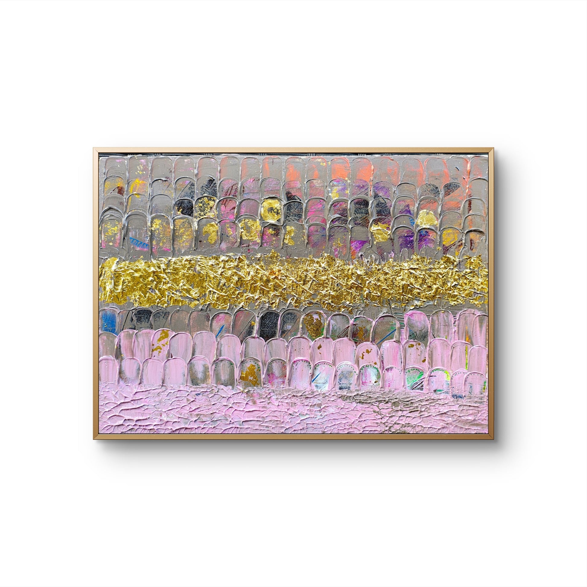 Elysian Veil is an ode to serenity and splendor — a composition that drapes the canvas in luminous harmony. Layers of pearlescent pinks, silvers, and violets interlace with rich veins of gold, forming a textural symphony that shimmers with quiet power. The central gilded band evokes transcendence, suggesting a threshold between the earthly and the divine.